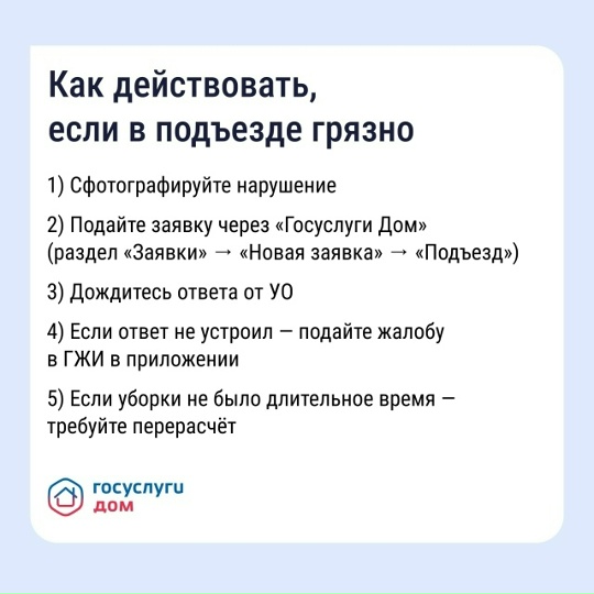 Как навести порядок в подъездеГрязные полы, пыльные перила, забитый мусоропровод — это прямое нарушение прав жильцов. Поддерживать чистоту в местах общего пользования обязана управляющая организация (УО).Рассказываем, какие рекомендации по уборке существуют и как повлиять на УО через приложение «Госуслуги Дом».Скачать «Госуслуги Дом» и навести порядок в подъезде: vk.cc/cR4yLN.