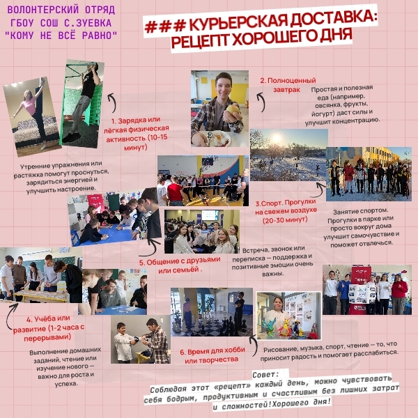 «Курьеры МИРа» поделились «Рецептом хорошего дня»: в областной эстафете волонтеров выполнено второе задание.Волонтерский отряд «Кому не всё равно!» ГБОУ СОШ с.Зуевка продолжает своё участие в областной эстафете, направленной на профилактику асоциальных проявлений в молодежной среде. Второй этап соревнований оказался творческим и позитивным: ребятам предстояло создать тематический фотоколлаж, иллюстрирующий их уникальный «Рецепт хорошего дня», наполненный полезными занятиями и отличным настроением.Наши волонтеры подошли к заданию креативно и с душой. Вместо стандартного набора скучных правил они представили настоящую «Курьерскую доставку». Основой коллажа стала идея о том, что рецепт позитивного дня складывается из простых, но важных ингредиентов.