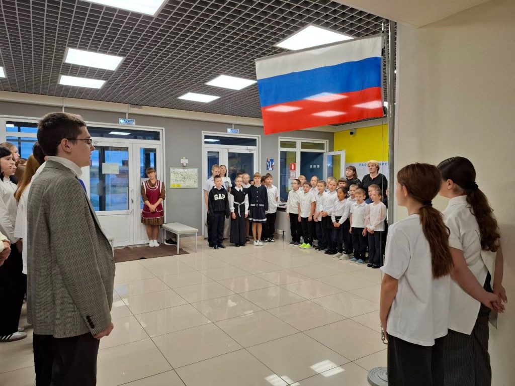 Мероприятие началось с церемонии поднятия Государственного флага России и исполнения гимна. Право поднять флаг получили ученики, отличившиеся в учебе и внеурочной деятельности: